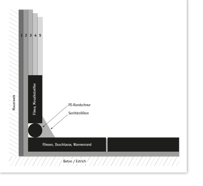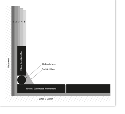 - Kontaktschicht: unter Einbettung eines Glasfasergitternetzes Flex-Fliesenkleber horizontal mit mittlerer Zahnung auftragen und aushärten lassen.